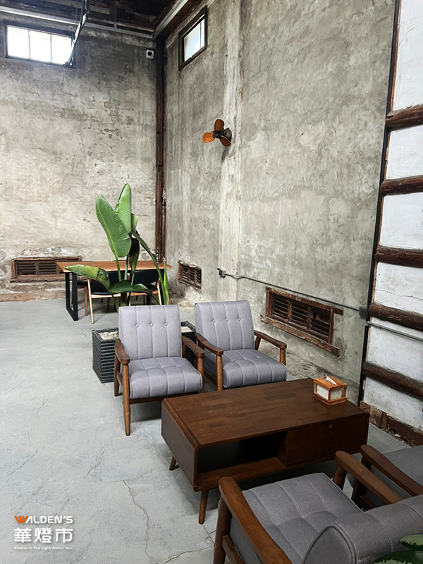 倉庫寬廣的挑高空間,業主在與華燈市師傅的討論下選擇芬朵16吋FINO-CHIC系列壁掛吊扇安裝牆壁,將風力針對座位區做重點吹送。