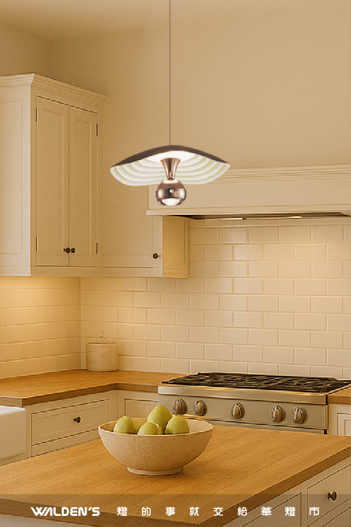 金屬燈罩利於形成下照光錐,強化吧台與餐桌焦點;