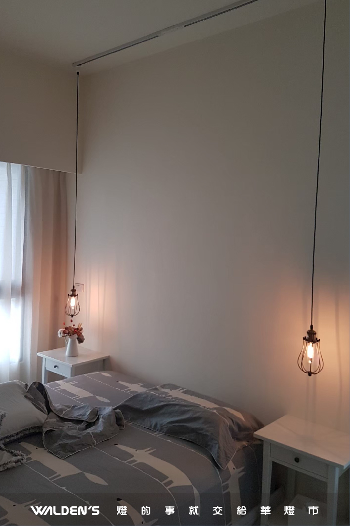 以小型單吊燈取代檯燈,釋放床頭櫃空間,同時提供集中、不刺眼的閱讀光源。