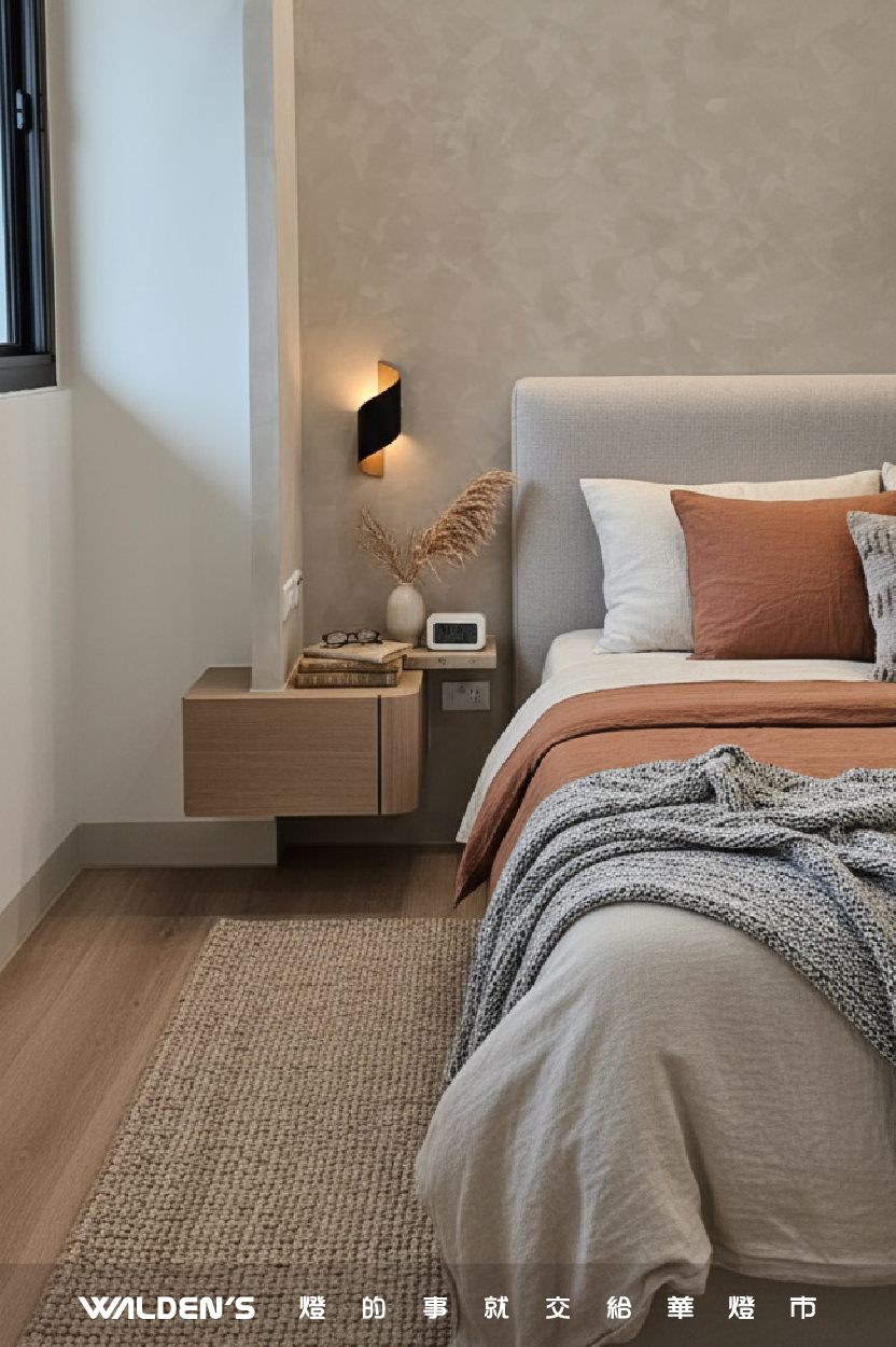 捨棄刺眼的頂燈,在臥室安裝床頭壁燈,光線溫潤、不直射眼睛。適中的黃光壁燈亮度,最適合睡前閱讀或滑手機,幫助身體進入放鬆模式。