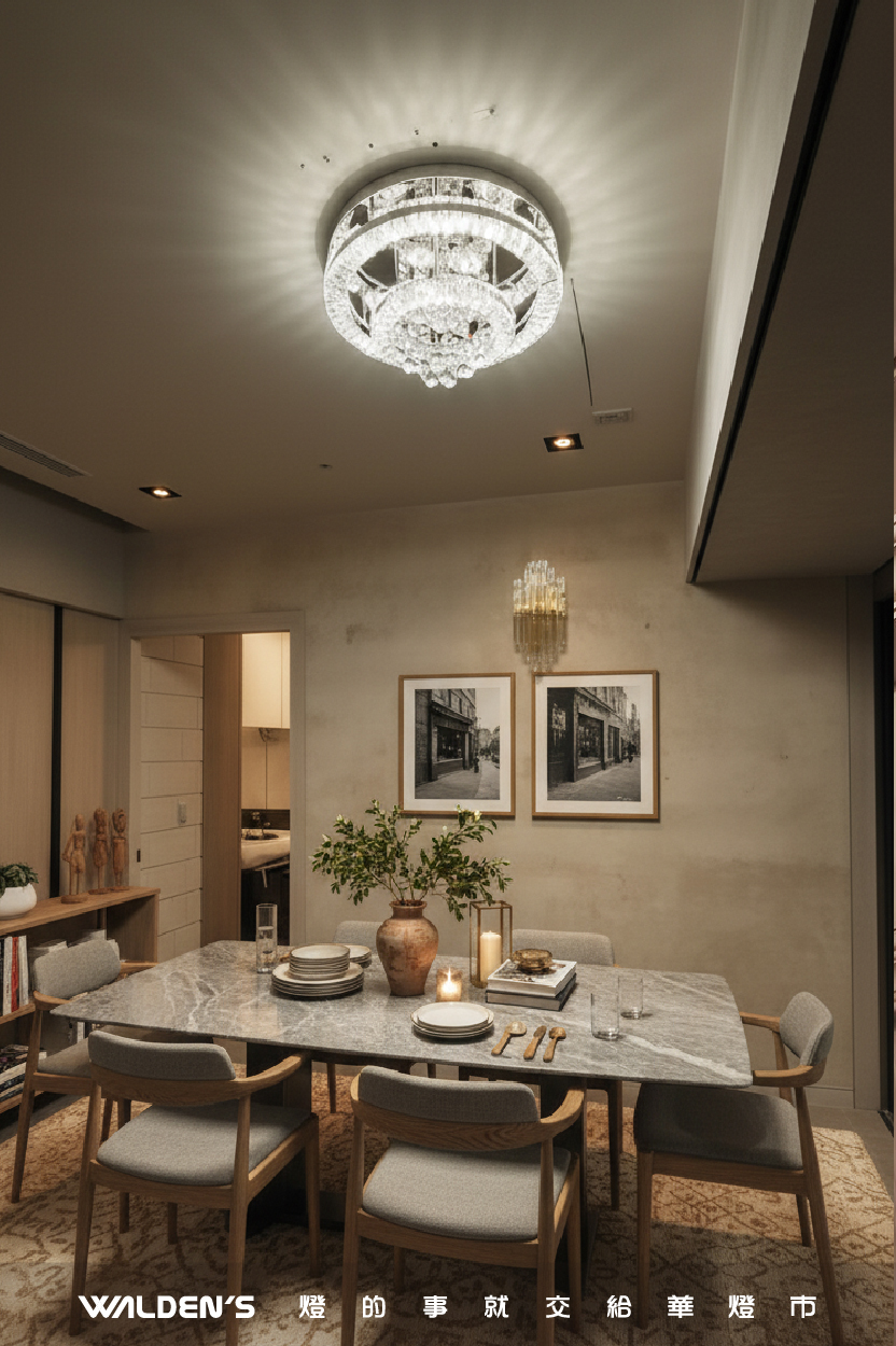 精緻小宅方案: 針對玄關或臥室等局部空間,挑選小型水晶吊燈即可在不佔用多餘空間的前提下,一秒升級生活品質與居家氛圍。