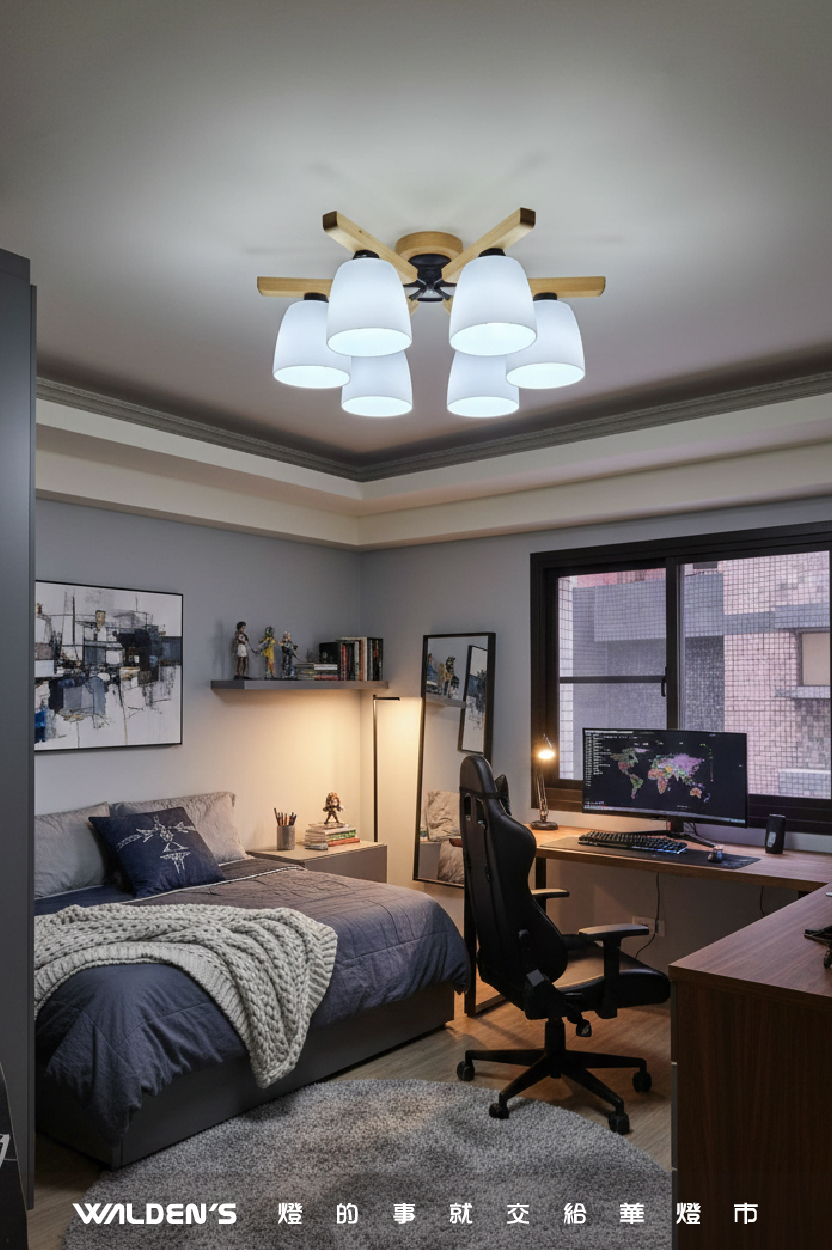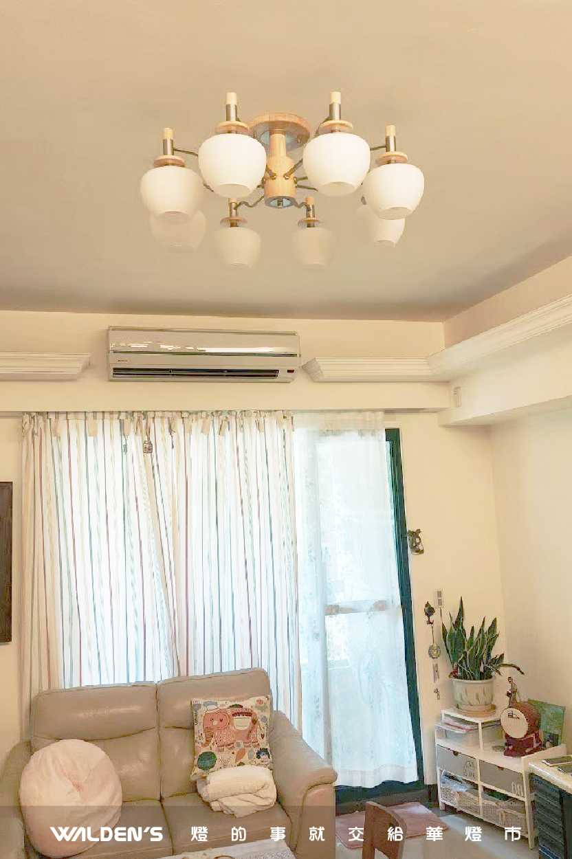北歐風半吸頂燈: 採用溫潤木質與簡約白色線條,營造回家即放鬆的清爽氛圍。
