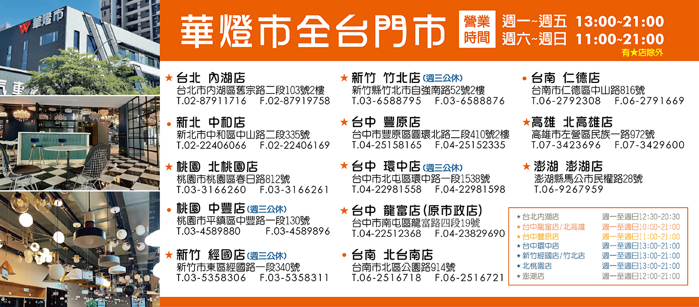 - 以上燈具費用皆不含光源(燈泡、燈管)&安裝費,若需協助及「選配燈泡」及「安裝服務」,需先致電客服人員,並另最低安裝工資700元,總安裝費用不滿700將以700元計算。