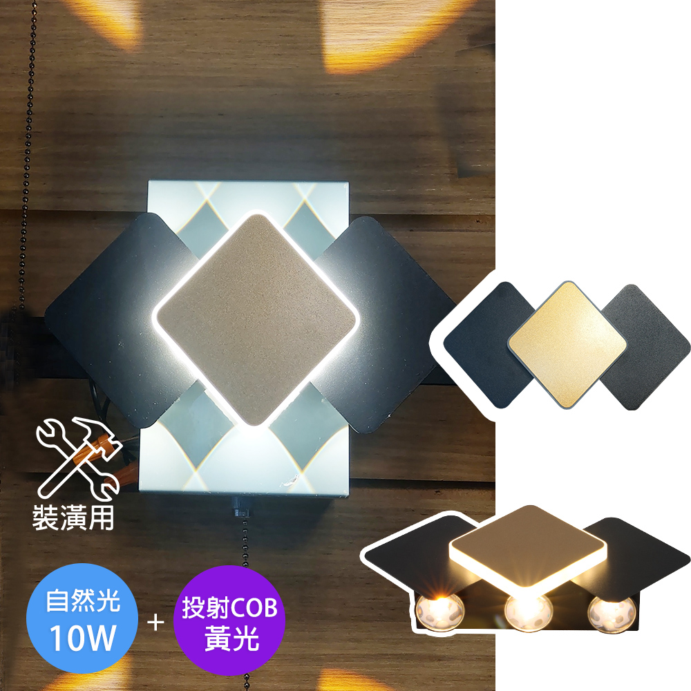 三菱線LED 10W自然光+投射COB黃光壁燈,黑金菱形設計,提升空間質感