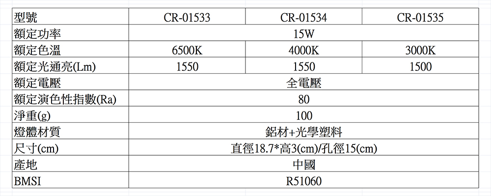 超薄崁燈 嵌燈LED 15W 高效超薄崁燈(15cm)-白光 自然光 黃光 全電壓 產品編號 CR-01534/ CR-01535/ CR-01533