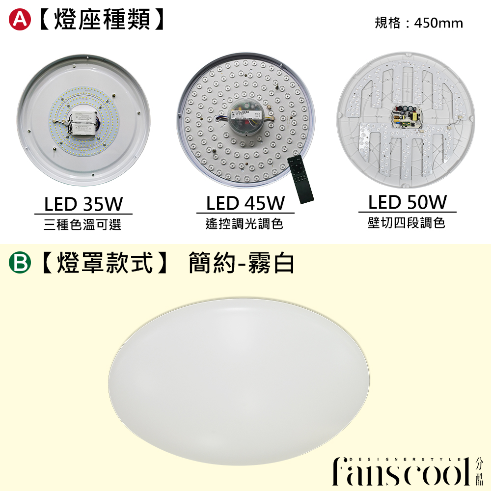 此款燈罩可搭配分酷系列多款 專屬 LED 吸頂燈座,包含 35W 三色溫切換、45W 遙控調光調色與 50W 壁切四段調色燈座,讓使用者可依照空間需求與生活習慣,自由搭配出最合適的照明功能。不論是客廳主燈、臥室柔光、餐廳氛圍照明或書房使用,此燈罩皆能提供優雅舒適的光環境。