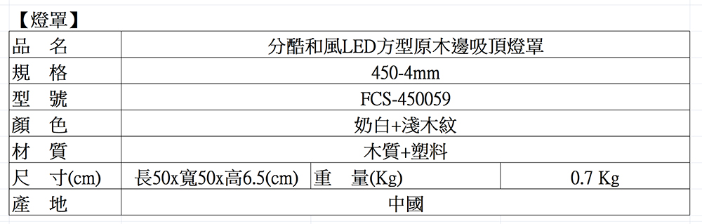 分酷 fanscool和風方型原木邊吸頂燈罩-奶白+淺木紋(450mm-4) 另選購燈座產品編號 FCS-450059